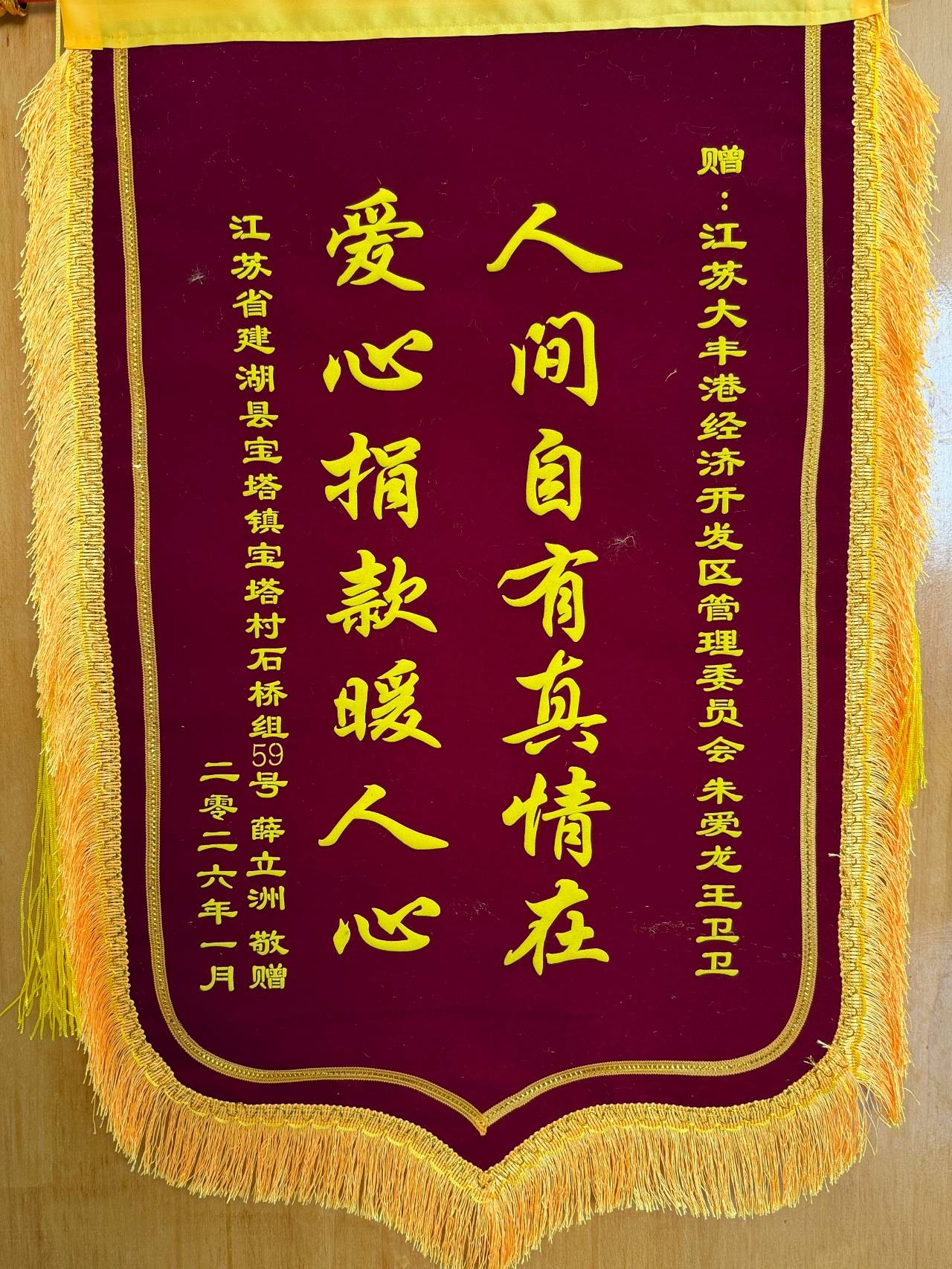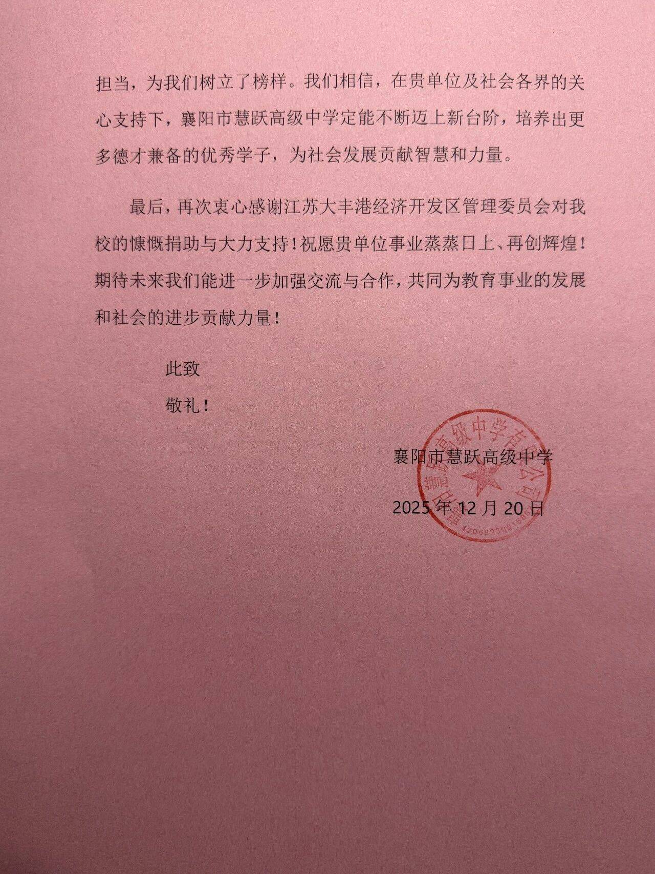 近日,江苏大丰港经济开发区管委会职工夫妇朱爱龙、王卫卫收到一封来自湖北襄阳市慧跃高级中学的感谢信。信中,学校对两人的爱心捐赠表达了衷心感谢,字里行间流淌着跨越千里的温暖情谊。