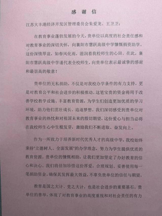 2026-01-11PG电子,PG电子官方网站,PG电子试玩,PG电子APP下载近日,江苏大丰港经济开发区管委会职工夫妇朱爱龙、王卫卫收到一封来自湖北的感谢信。在信中,襄阳市慧跃高级中学向两人的助学善举表达了衷心感谢。