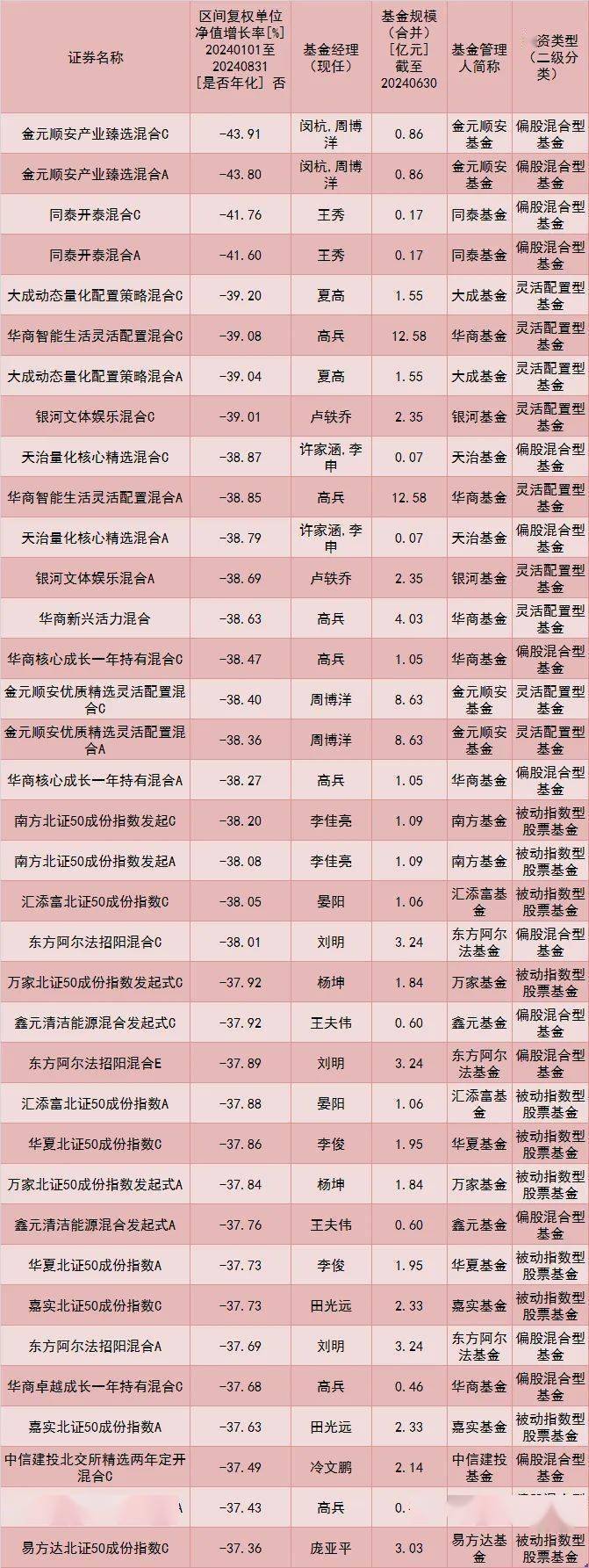 前8个月,大成动态量化配置策略混合、华商智能生活灵活配置、银河文体娱乐混合、东方阿尔法招阳混合等多只基金净值下跌超过35%。