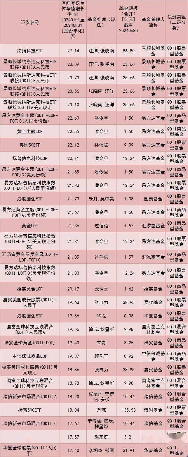 QDII基金方面,易方达美国50ETF、易方达标普信息科技指数(QDII-LOF)、国泰港股国企ETF、汇添富黄金及多只基金前8个月基金净值涨幅超过20%。