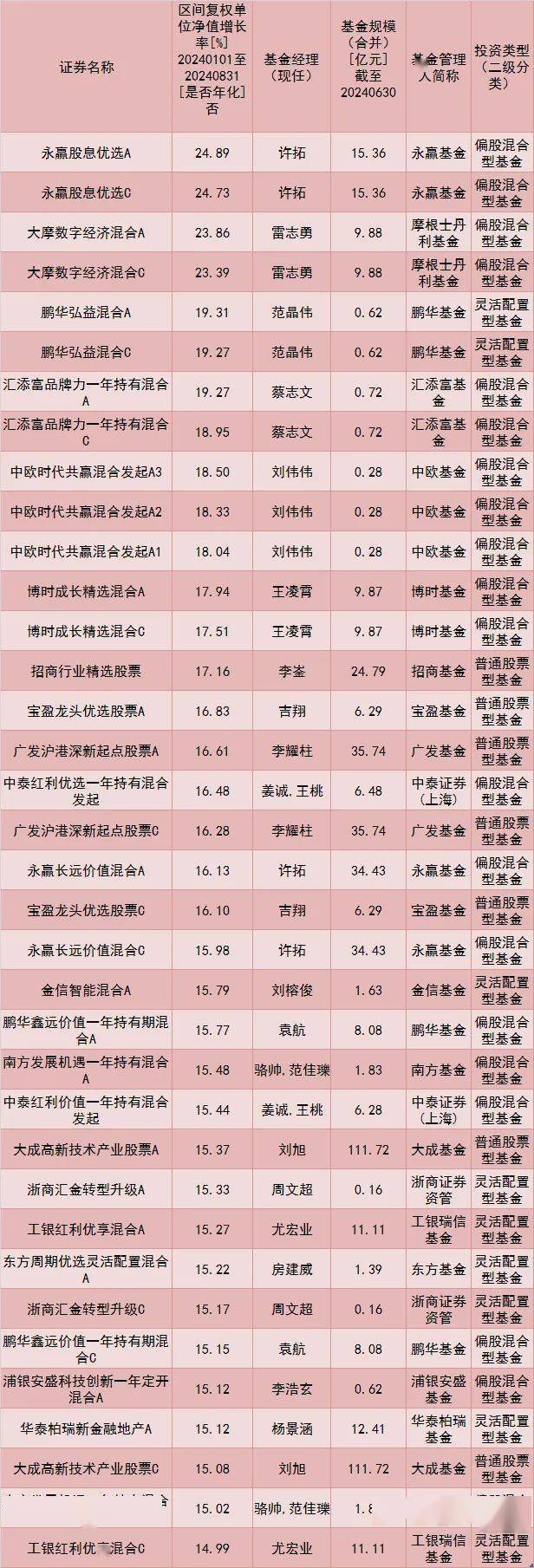 从主动权益类基金的业绩表现来看,由许拓掌管的永赢股息优选A和永赢股息优选C在前8个月分别以24.89%、24.73%的收益居于前列。