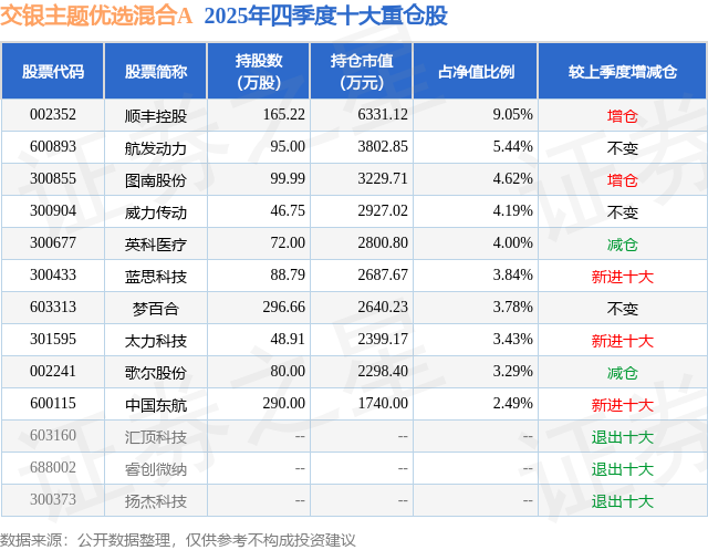 根据2025基金年报公募基金重仓股数据,重仓该股的公募基金共1家,其中持有数量最多的公募基金为交银施罗德基金的交银主题优选混合A。交银主题优选混合A目前规模为6.92亿元,最新净值2.3256(4月9日),较上一交易日下跌0.34%,近一年上涨35.52%。该公募基金现任基金经理为沈楠。沈楠在任的基金产品包括:交银国企改革灵活配置混合A,管理时间为2015年6月10日至今,期间收益率为136.71%;交银瑞思混合(LOF),管理时间为2020年2月21日至今,期间收益率为34.07%;交银稳固收益债券A,管理时间为2026年3月17日至今,期间收益率为0.51%。