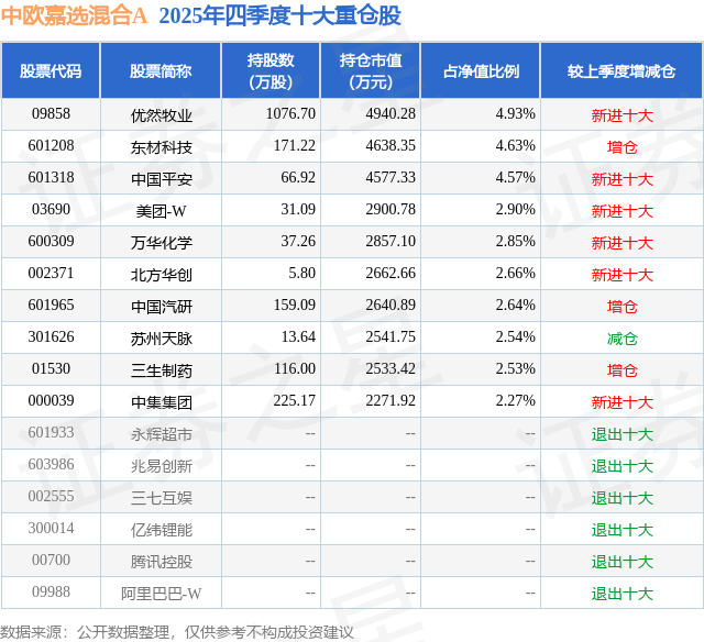 根据2025基金年报公募基金重仓股数据,重仓该股的公募基金共2家,其中持有数量最多的公募基金为中欧基金的中欧嘉选混合A。中欧嘉选混合A目前规模为9.46亿元,最新净值0.8372(4月9日),较上一交易日下跌0.49%,近一年上涨30.26%。该公募基金现任基金经理为王健。王健在任的基金产品包括:中欧新动力混合(LOF)A,管理时间为2016年11月3日至今,期间收益率为139.78%;中欧嘉泽灵活配置混合,管理时间为2018年1月26日至今,期间收益率为148.5%;中欧嘉和三年混合A,管理时间为2020年5月28日至今,期间收益率为20.12%;中欧均衡成长混合A,管理时间为2020年12月11日至今,期间收益率为-8.53%。