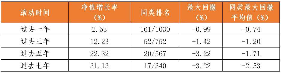 备注:基金净值增长率、业绩排名、最大回撤、同类最大回撤平均值等数据来源银河证券基金评价中心,公司固收类基金超额收益数据来源于国泰海通证券《基金公司权益及固定收益类资产超额收益排行榜》,数据截至2026年3月31日。固收类大型基金公司分类按照海通证券规模排行榜近一年主动固收的平均规模进行划分,按照基金公司规模自大到小进行排序,其中累计平均主动固收规模占比达到全市场主动固收规模50%的基金公司划分为大型基金公司。基金管理公司超额收益是指基金公司管理的主动型基金超额收益(基金净值增长率减去业绩比较基准后的收益)按照期间管理资产规模加权计算的平均超额收益