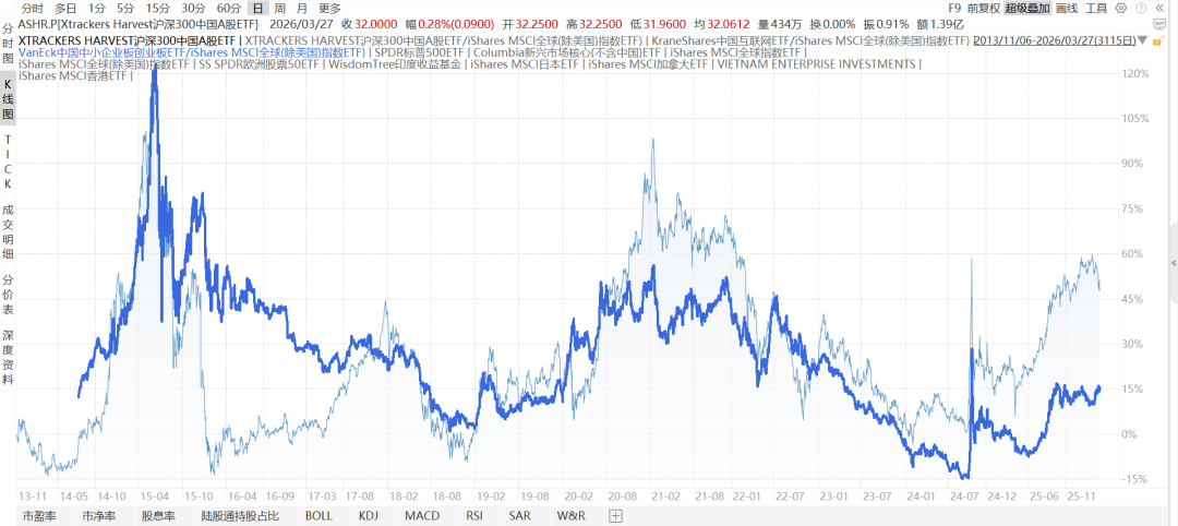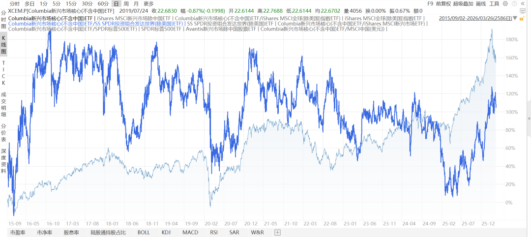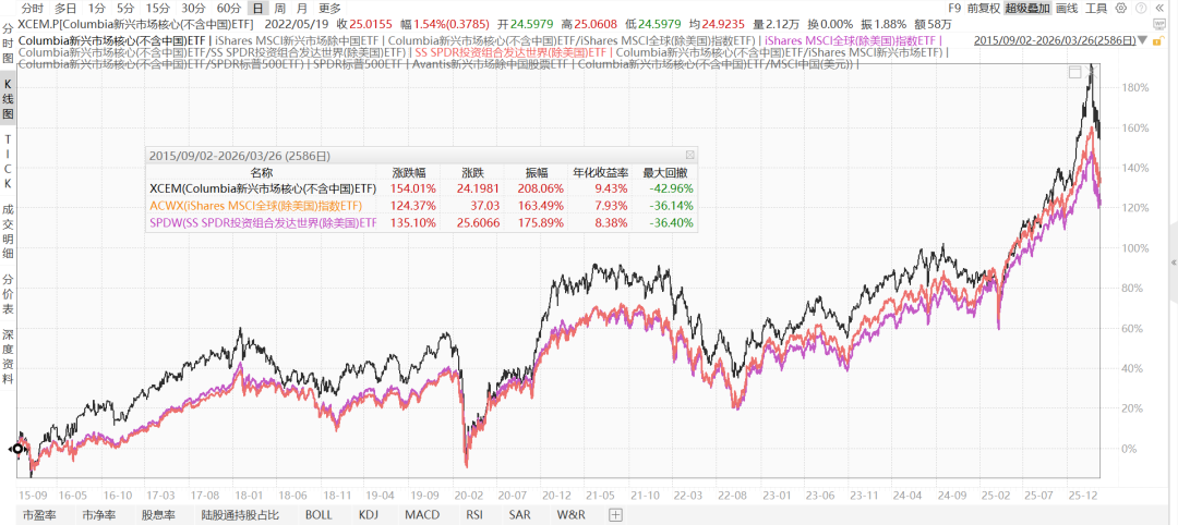 下图是新兴市场除中国XCEM/发达市场除美国SPDW,2015-9至今,其中2025年以来表现不错。