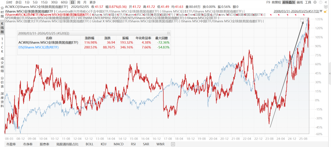 下图是以色列VS全球除美国,2008.4至今,自从2023年进攻加沙以来,以色列股市表现一直不错。