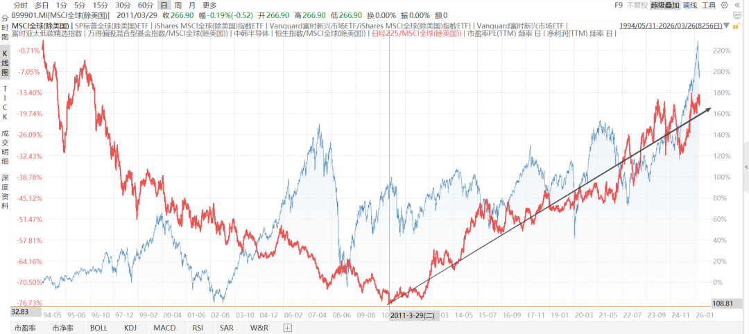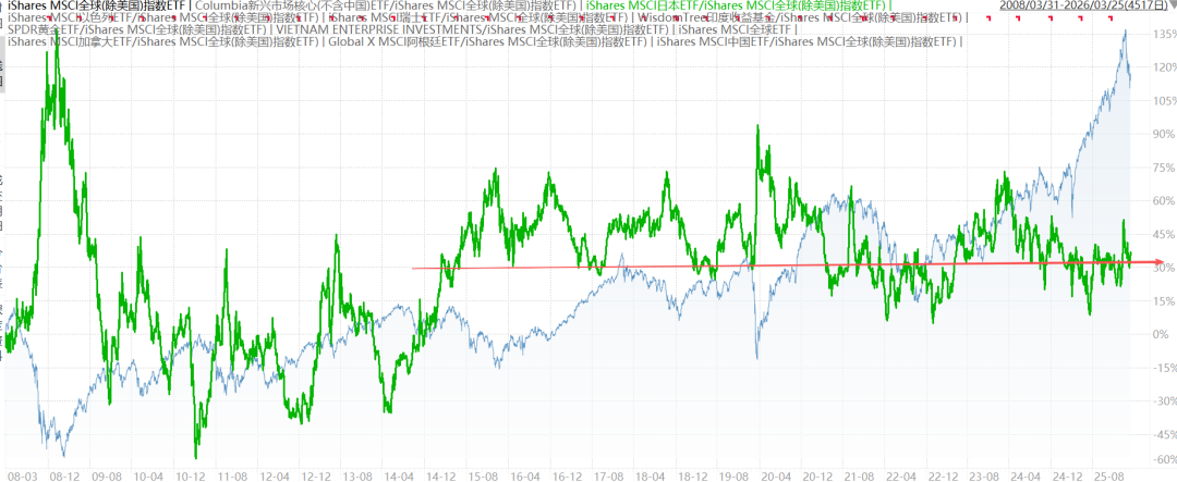 下图是日经225/MSCI ACWX(全球除美国)(1994-6至今),近15年持续跑赢。