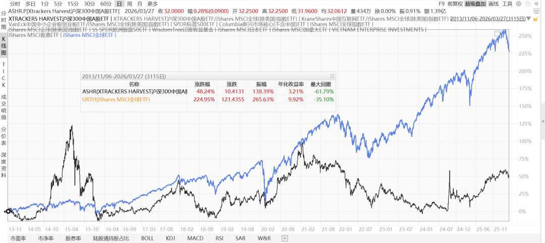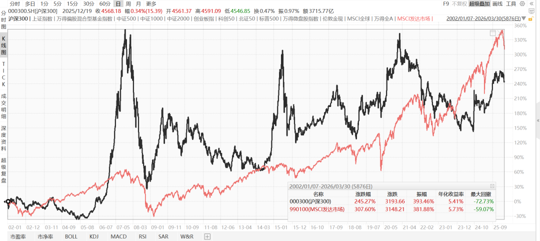 一是波动大。下图是中国的代表性指数沪深300(黑线)对比MSCI全球指数,2002年至今,你会看到,中国股市的波动特别大,赚钱难度高。
