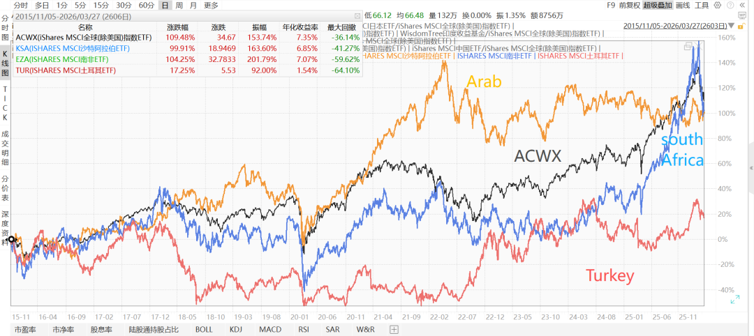下图是沙特、土耳其、南非对比全球除美国(ACWX),2015-11至今,采用美元计价。