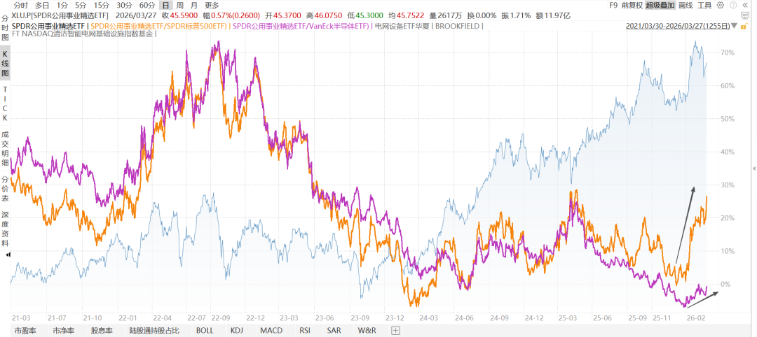 下图分别是XLU/标普500 (桔色线) ,XLU/费城半导体指数(紫色线年。