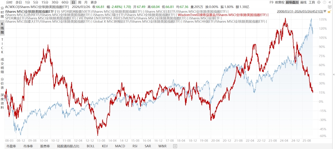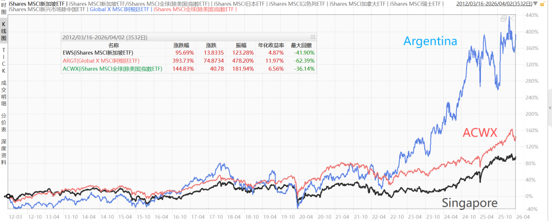 比如泰国、印尼、马来西亚、菲律宾,都远不如全球除美国(ACWX),2012-4至今,采用美元计价。