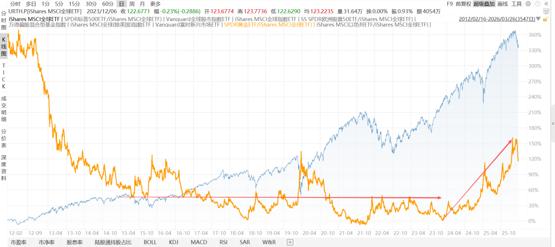 下图是黄金/MSCI全球 ETF 2010.2至今,美元计价。2017年以来持续跑平全球股市,24年以来甚至跑赢。